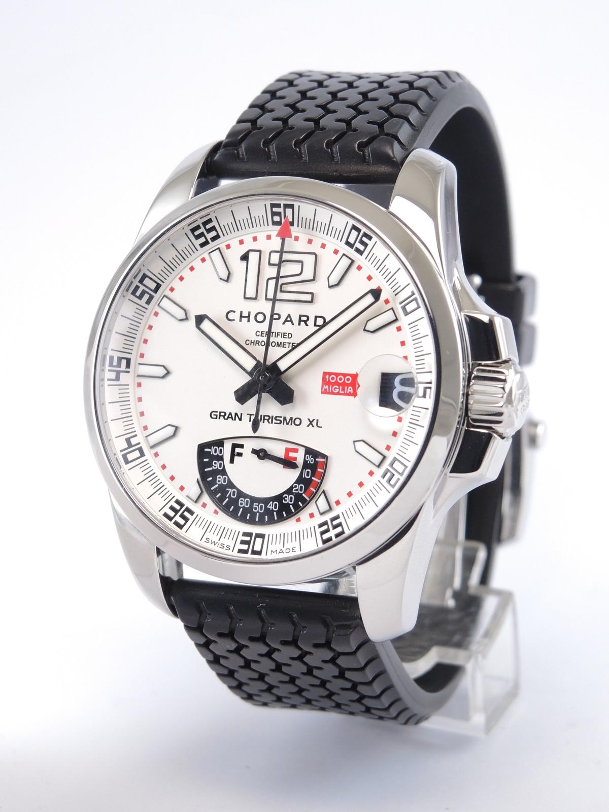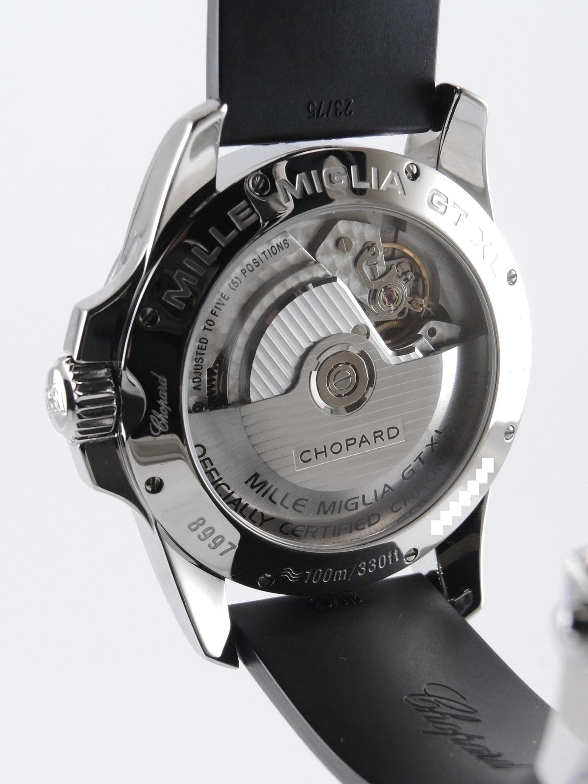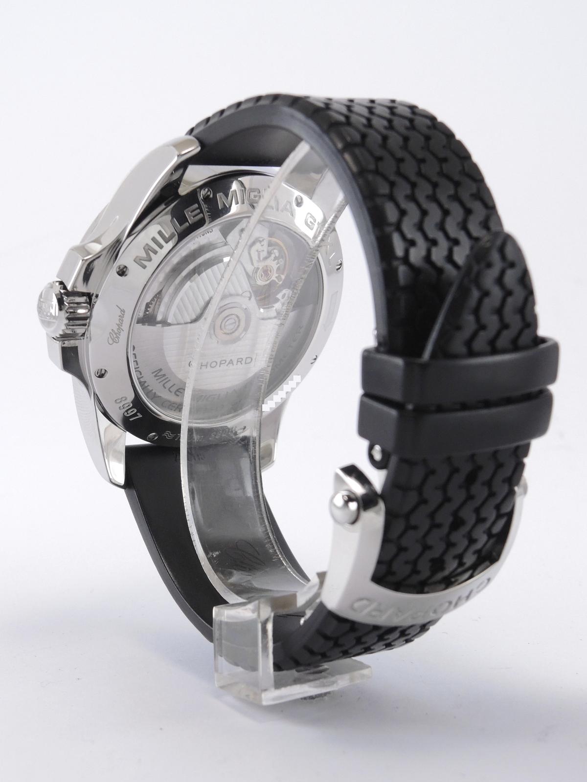 Mille Miglia Gran Turismo XL "Power Reserve" With Box - Steel case on rubber strap with original folding clasp, black dial, luminescent hands and indexes, date, power reserve indicator, sapphire glass and case back, screw-down crown, automatic movement. With original box.