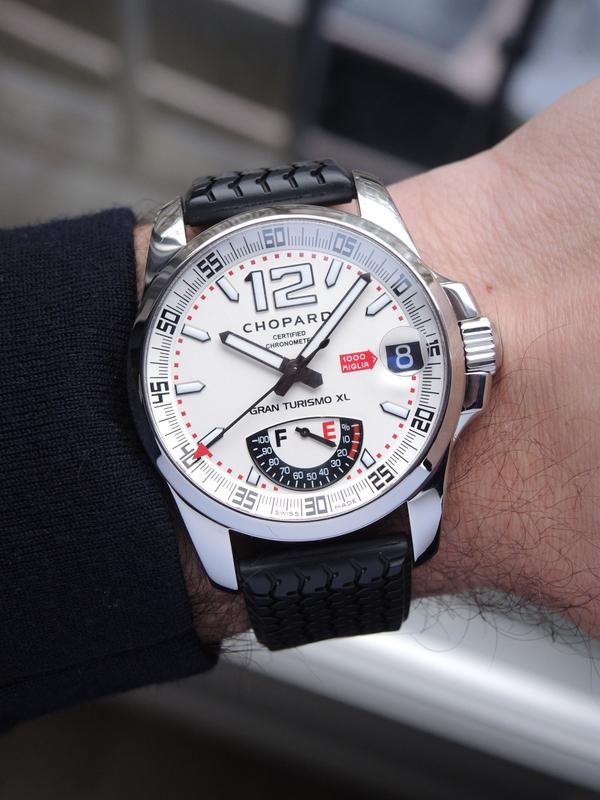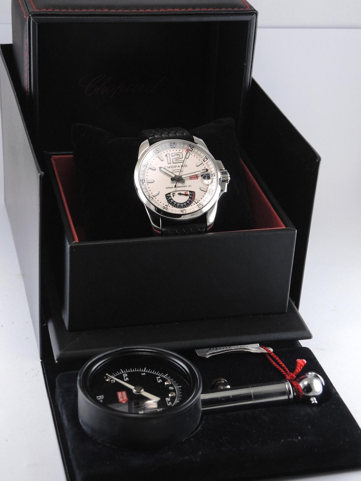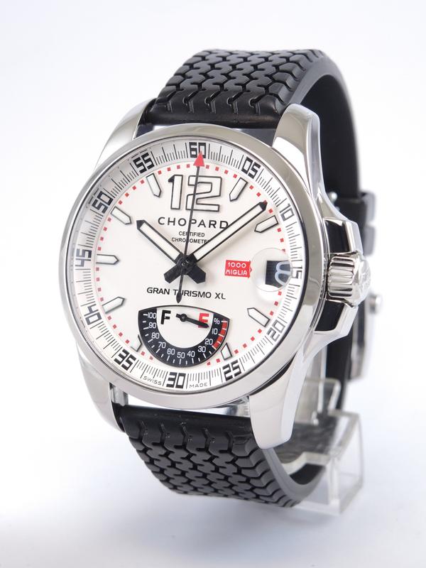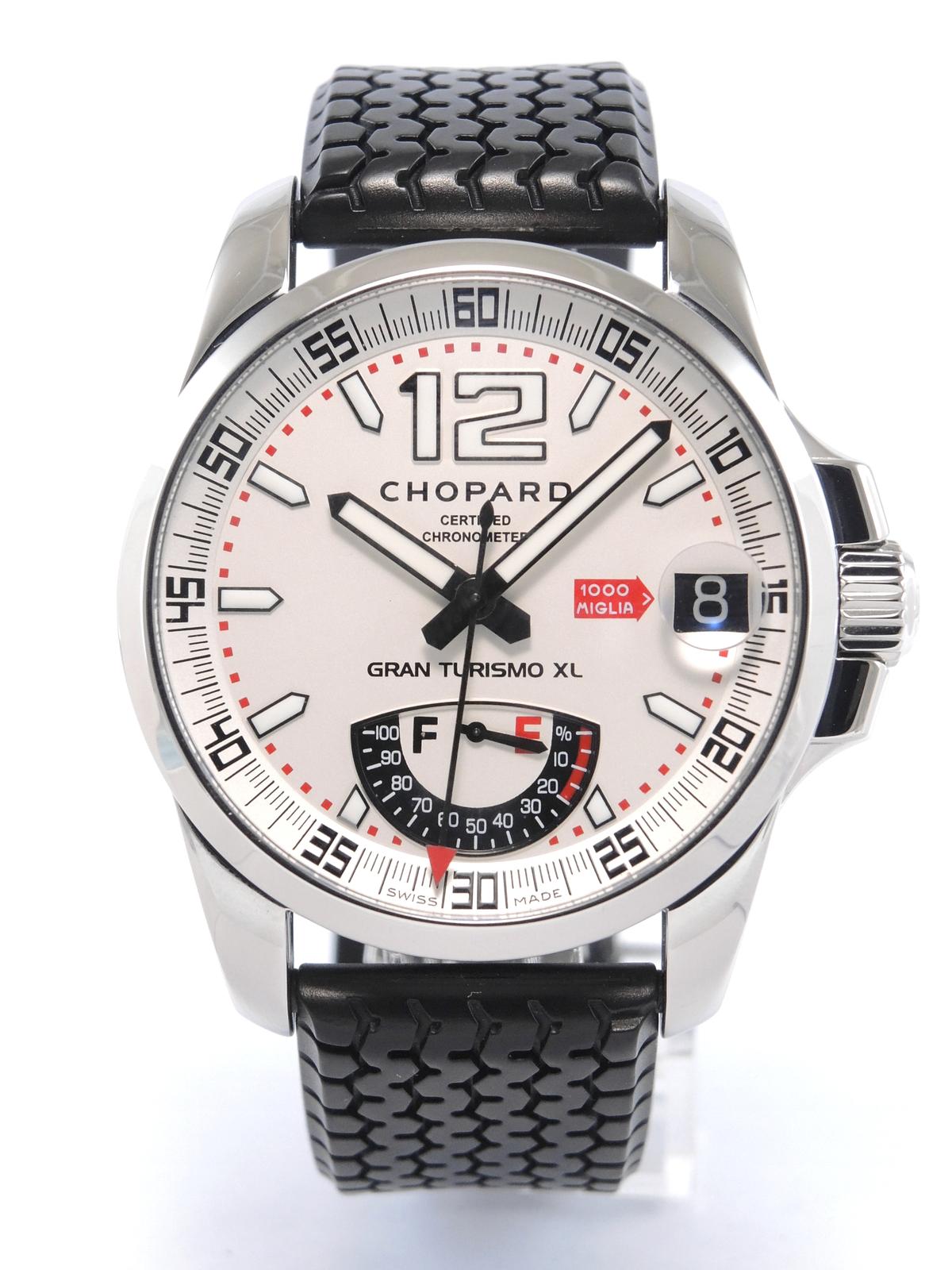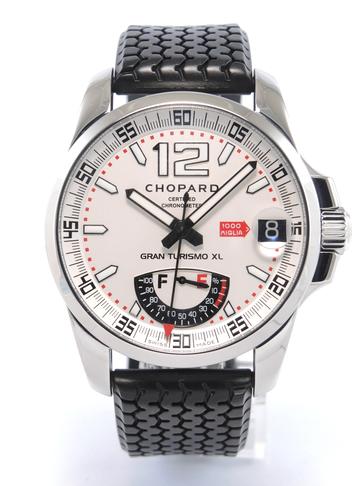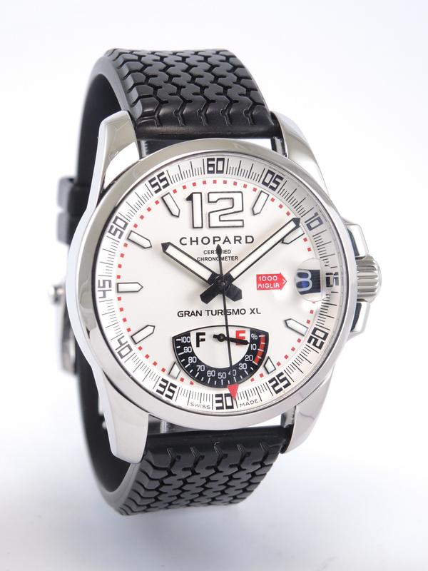 Mille Miglia Gran Turismo XL "Power Reserve" With Box - Steel case on rubber strap with original folding clasp, black dial, luminescent hands and indexes, date, power reserve indicator, sapphire glass and case back, screw-down crown, automatic movement. With original box.