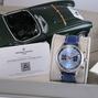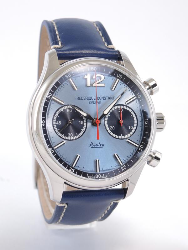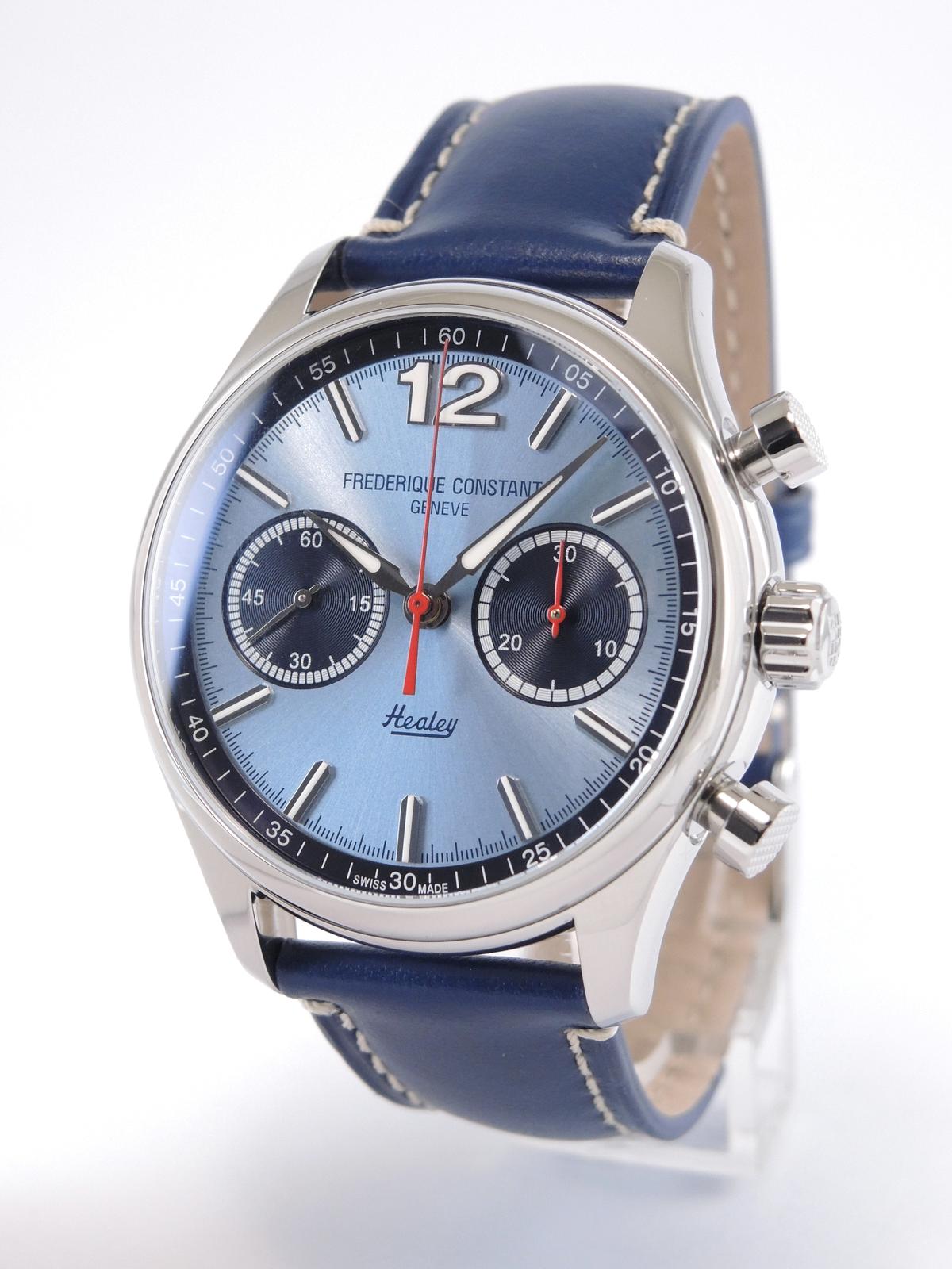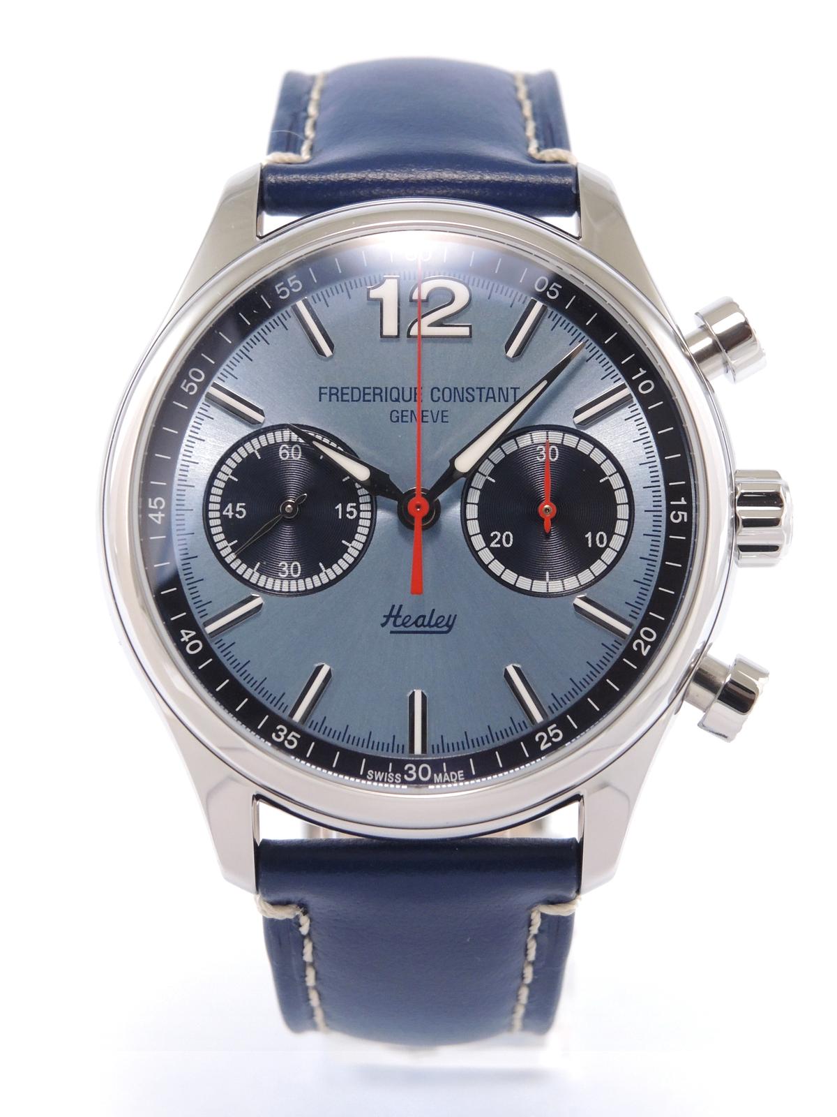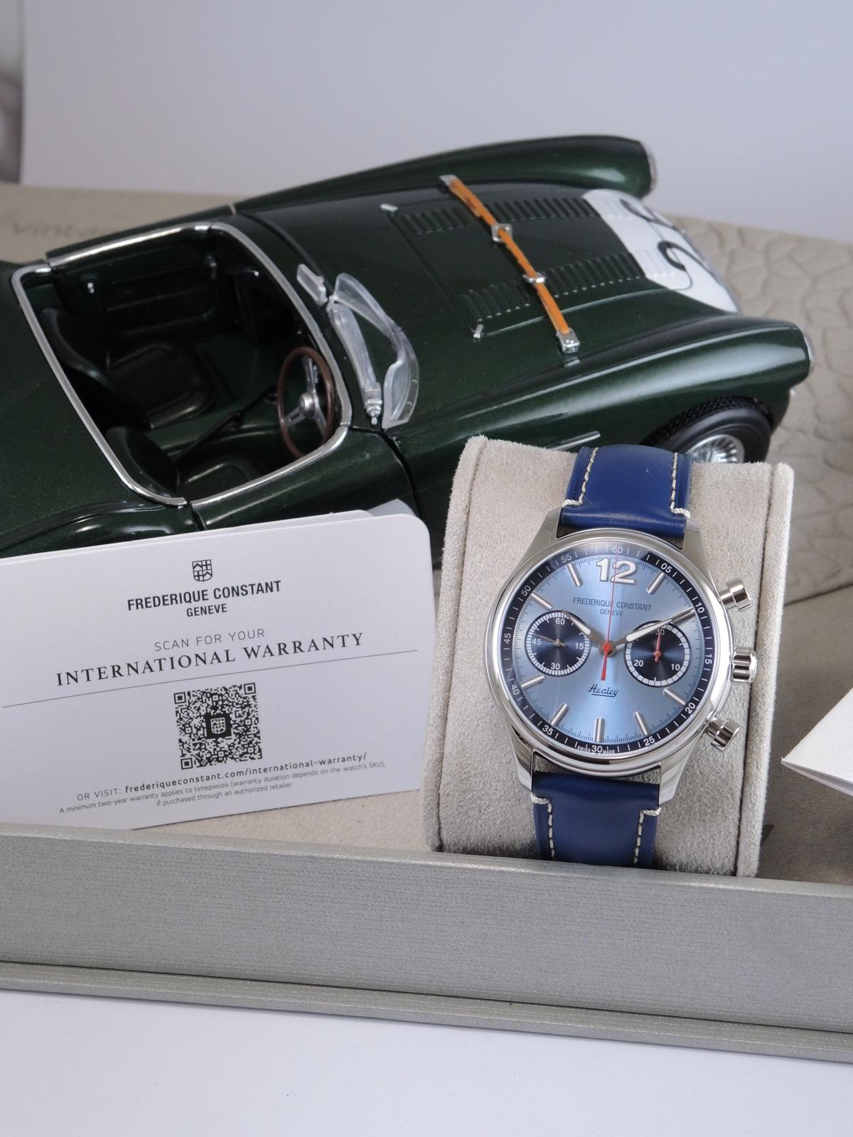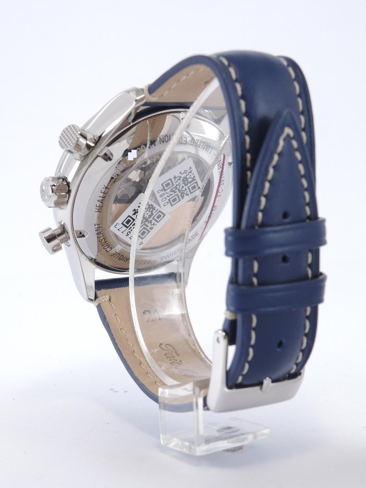 Vintage Rally Healey FC-397HLBN5B6 Full Set Limited Edition - Boitier acier sur bracelet cuir, boucle ardillon, cadran bleu soleillé, chronographe, deux compteurs, verre et fond de boîte saphir, mouvement automatique. Avec boîte et papiers d'origine, set complet ! Edition limitée " Austin Healey", 1888 exemplaires ! Jamais portée, comme neuve.