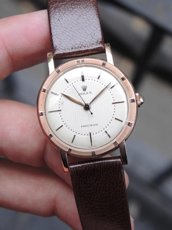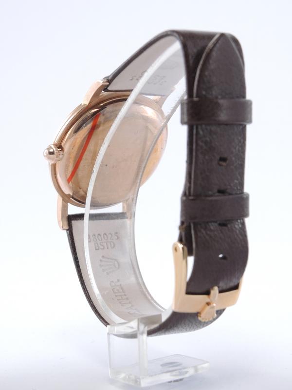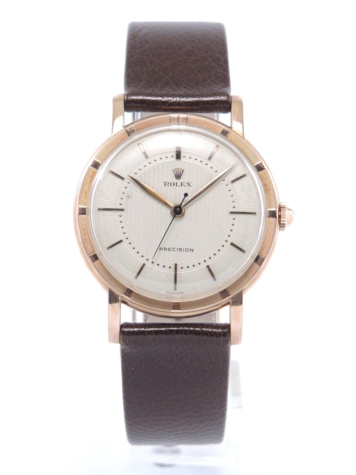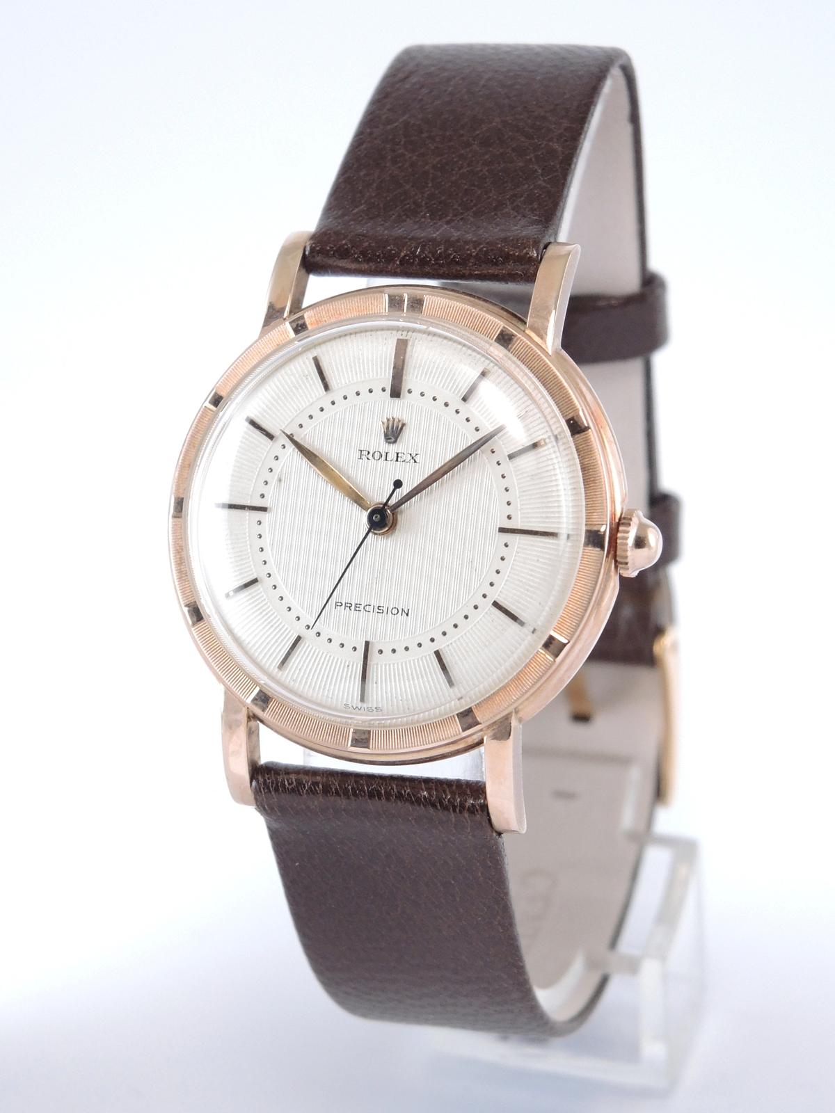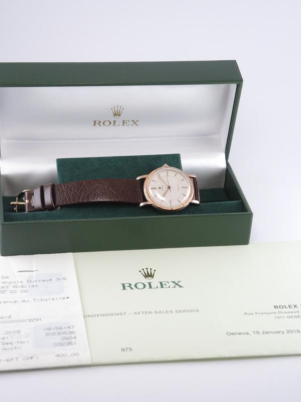 Precision Vintage Box & Rolex Restoration - Boitier or rose sur cuir, boucle ardillon en or, cadran blanc guilloché, indexes bâtons, aiguilles feuilles, verre pexi, mouvement mécanique à remontage manuel. Avec écrin et papier de restoration Rolex 2018.